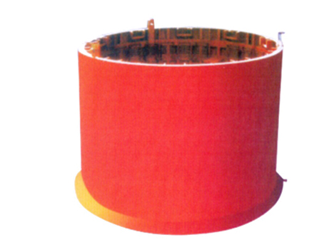 井整體移動金屬模板主體結(jié)構(gòu)為多塊圓弧形金屬板塊連接形成單縫式環(huán)形結(jié)構(gòu),并由數(shù)層圓環(huán)連成只有一個收縮口的剛性模板。模板支脫模動作通過氣動液壓泵驅(qū)動一組伸縮液壓缸,并通過手動液壓閥實現(xiàn)的。安裝在主體模板下端的下刃腳,能防治混凝土跑漿,實現(xiàn)了下行砌壁方式。該模板具有剛性大整體強度高,多次拆裝后變形量小的特點,液壓收縮機構(gòu)能夠靈活的進行脫模、立模。因而,在煤礦和金屬礦山井筒砌壁時被廣泛使用。